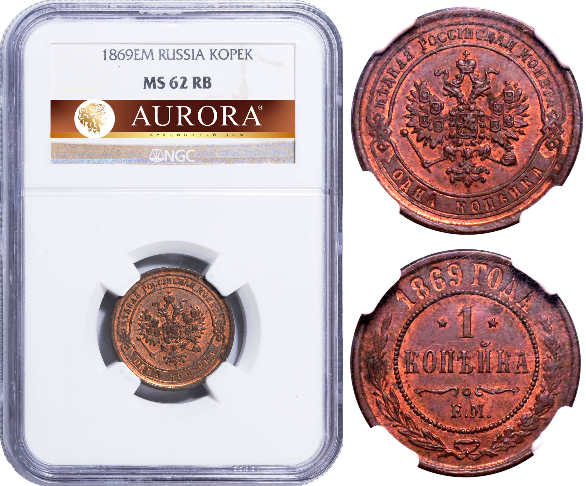 1 копейка 1869 года. "ЕМ". NGC MS62RB. ПРЕДТОП-ГРЕЙД