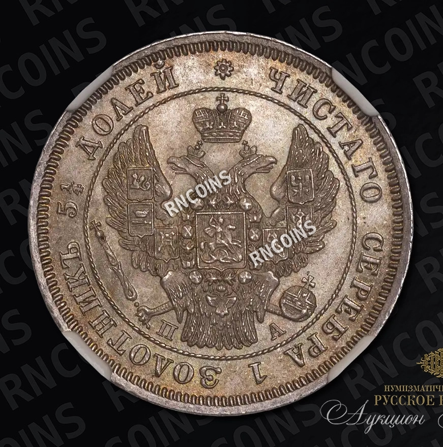 Серебро Биткин 294 Сохранность NGC MS66 Штемпельный блеск. Красивая светло-серая с глубоким радужно-золотистым отливом патина. Безупречно прочеканенный, слегка матированный рельеф. Без каких-либо заметных следов обращения. Следуя информации из профильных интернет-источников, одна из всего четырех в столь выдающейся степени сохранности монет (NGC и/или PCGS), когда-либо выставлявшихся на аукционных торгах. NGC: всего 47 экземпляров: MS66 - предыдущий грейд (4); MS67 - TOP POP (1)