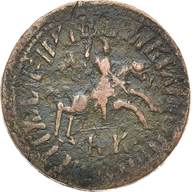 Медь. 7,97г. Набережный монетный двор. Аверс: "АЛЕѮIЕВIЧЬ" вместо "АЛЕѮIЕВИЧЬ"; "•Б•К•", вверху ничего нет. Реверс: вверху украшение, написание номинала и даты по II варианту: "КОПЕИКА", "҂АѰАI". Уздеников 2317(–). Биткин 2366 (R1). 4 рубля по Ильину. Дьяков 52, 3054 (R2). VF. Интересный коллекционный экземпляр. Светло-коричневая патина. Следы лёгкой коррозии. Чрезвычайно редка. Относится к группе необычных типовых медных монет периода правления Петра I.