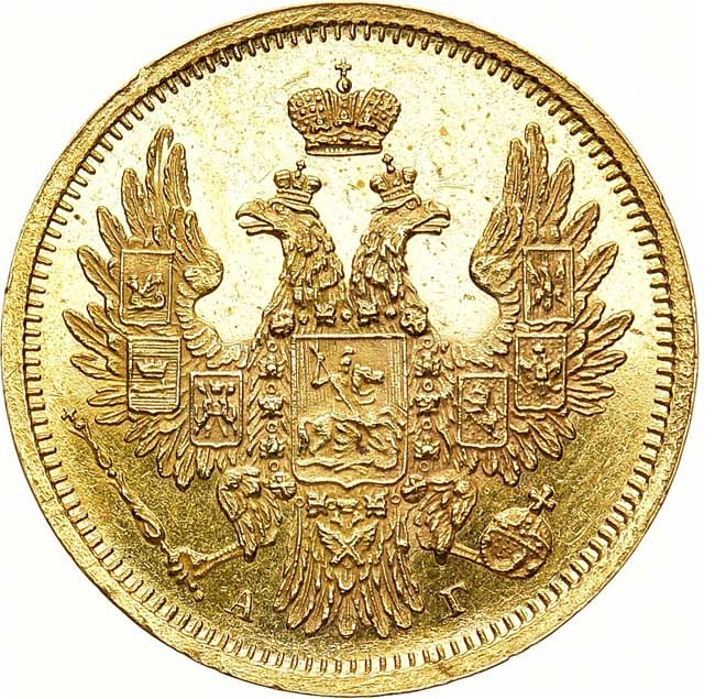 Золото. 6,53г. Уздеников 0240(•). Биткин 3. UNC. Яркий переливающийся штемпельный блеск с зеркальным эффектом. Матированный рельеф. Следы легкой чистки. Редка. 5 рублей 1857 года встречаются редко.