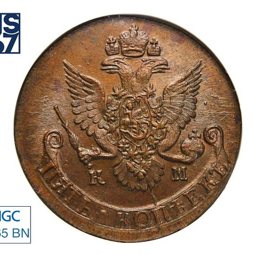 5 копеек 1786. КМ. В слабе NGC MS 65 BN. Топ грейд. Единственная в высшем грейде.