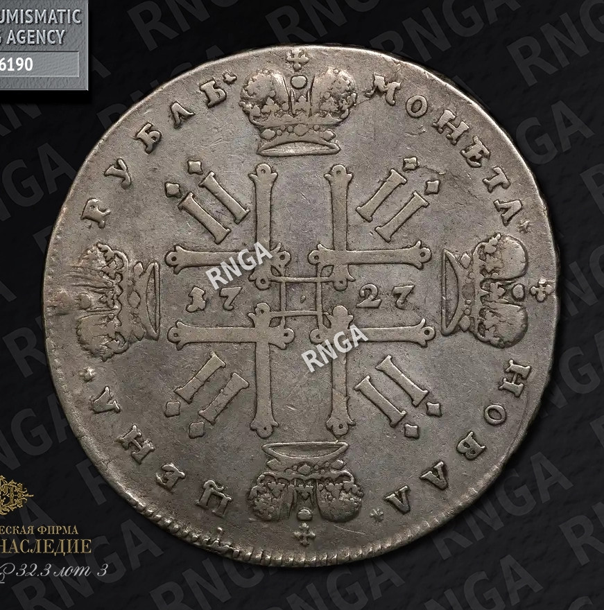 Аверс: Тип 1727-1729 годов. Орел на груди без корон. Пять наплечников. Круговая надпись разделена звездами, заканчивается звездой. Реверс: Без штриховки внутри корон. Круговая надпись разделена звездами. Серебро 28,30 гр. Биткин 21 Петров 3 руб. Сохранность RNGA VF25 Легкий штемпельный блеск. Равномерная серо-золотистая патина.