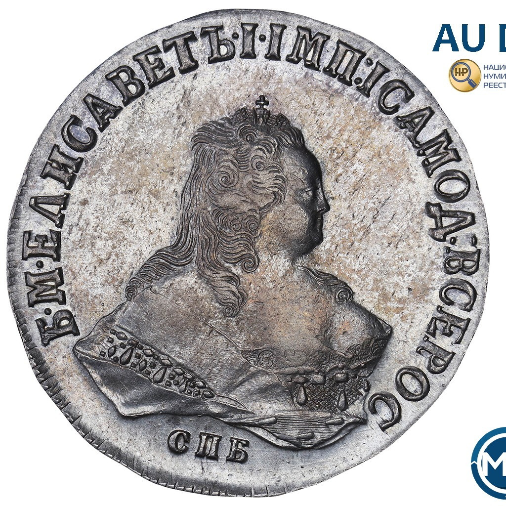 Без знака минцмейстера. "Рубль" между точками. Уздеников 834. Биткин 266. Дьяков 72,243. 3 рубля по Петрову. Поверхностная коррозия. Фиолетовая патина. Год: 1751 Материал: Серебро Период: Елизавета Петровна Грейд: AU